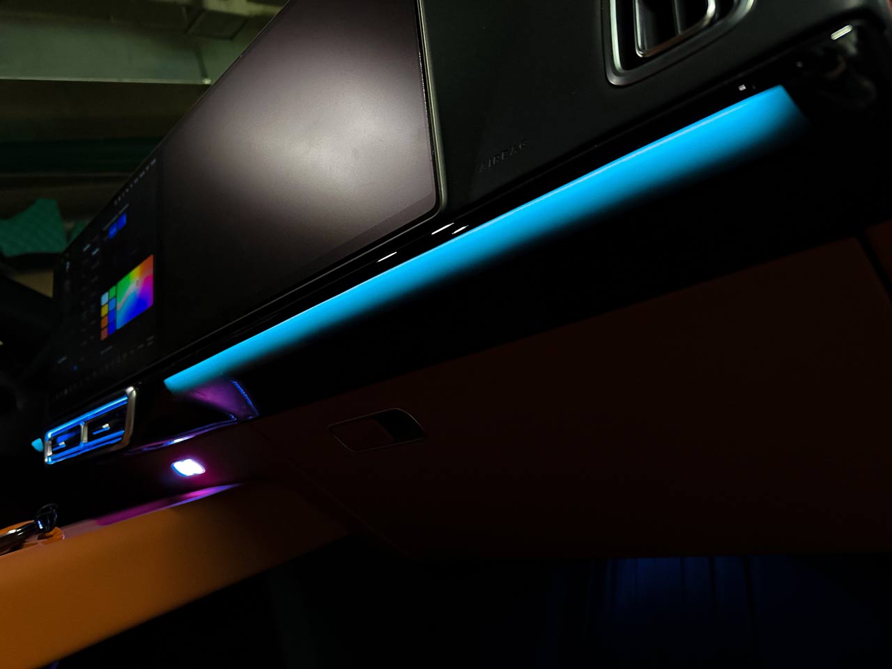 Контурная подсветка может комбинироваться с другими элементами дополнительного освещения – подсветкой подстаканников, зоны ног, дверных ручек и пр.
