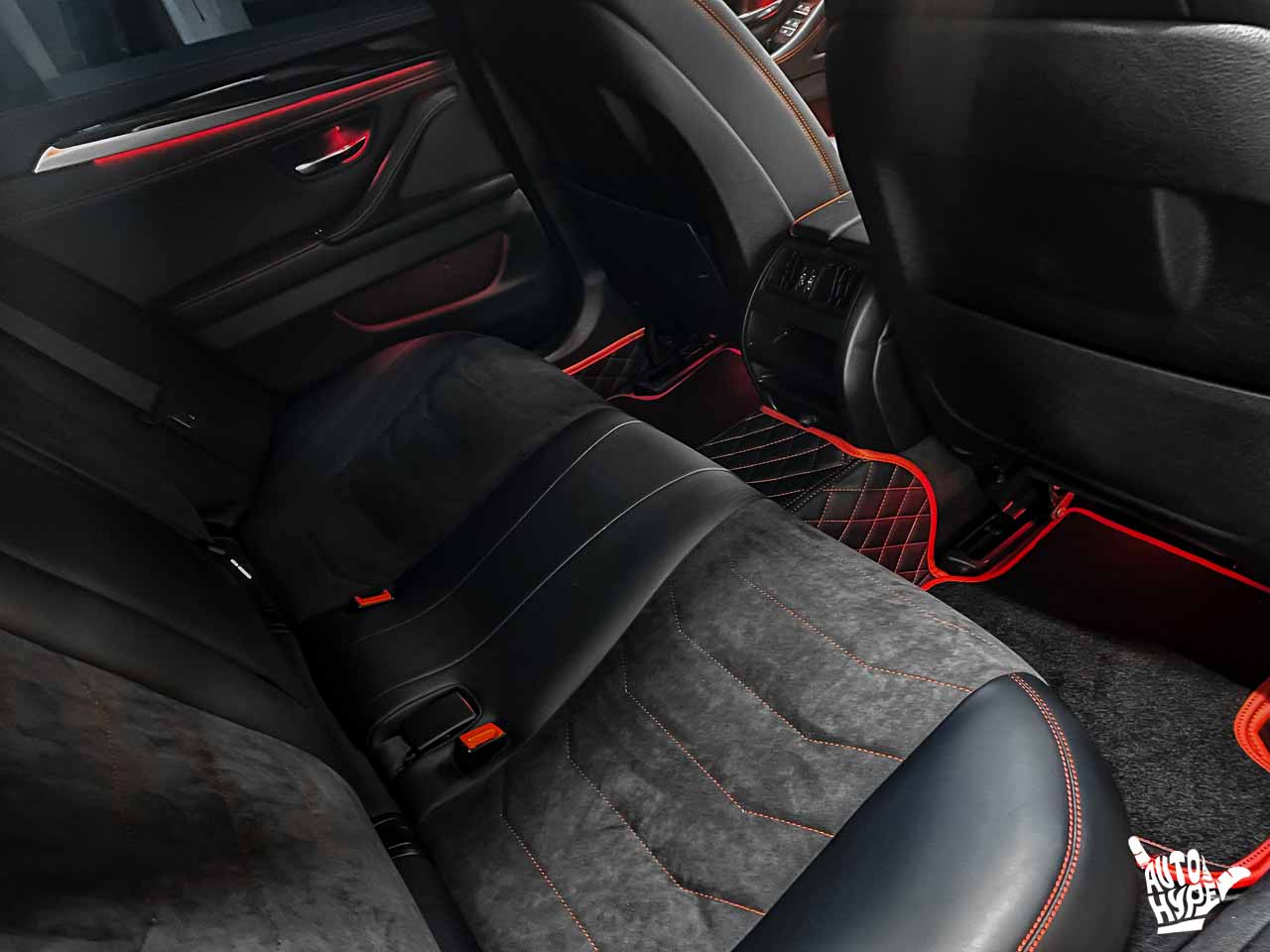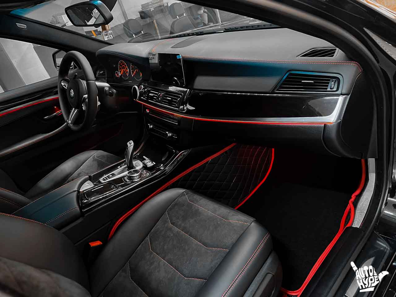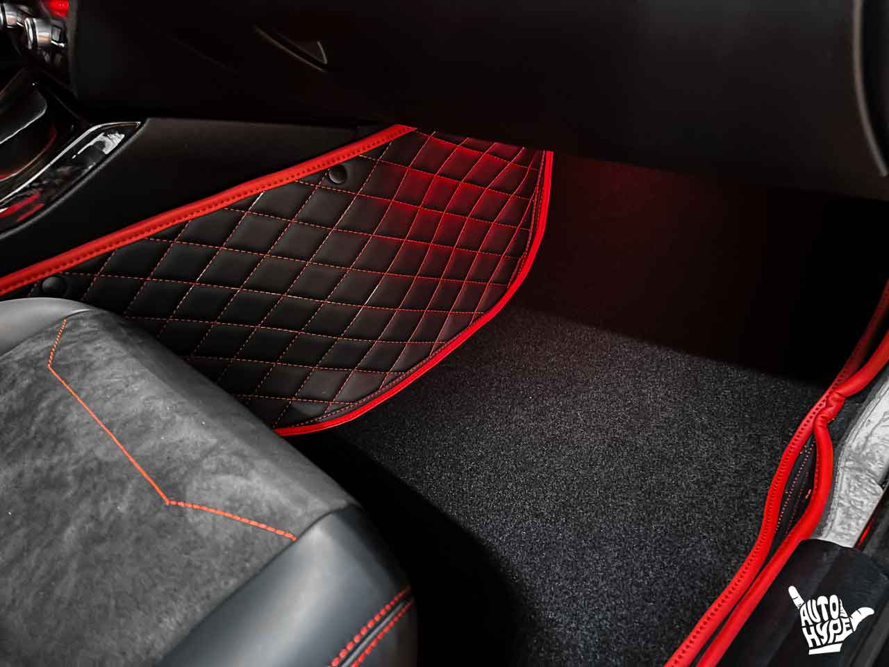Для этого BMW 8-й серии мы пошили ворсовые ковры с красным кантом и разместили их поверх 3d-ковров из экокожи для усиленной защиты салона от грязи и дорожных реагентов.