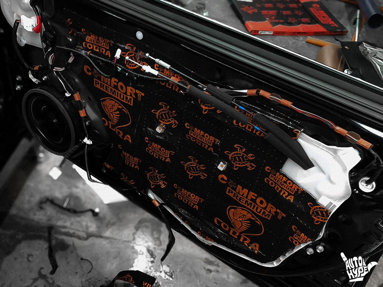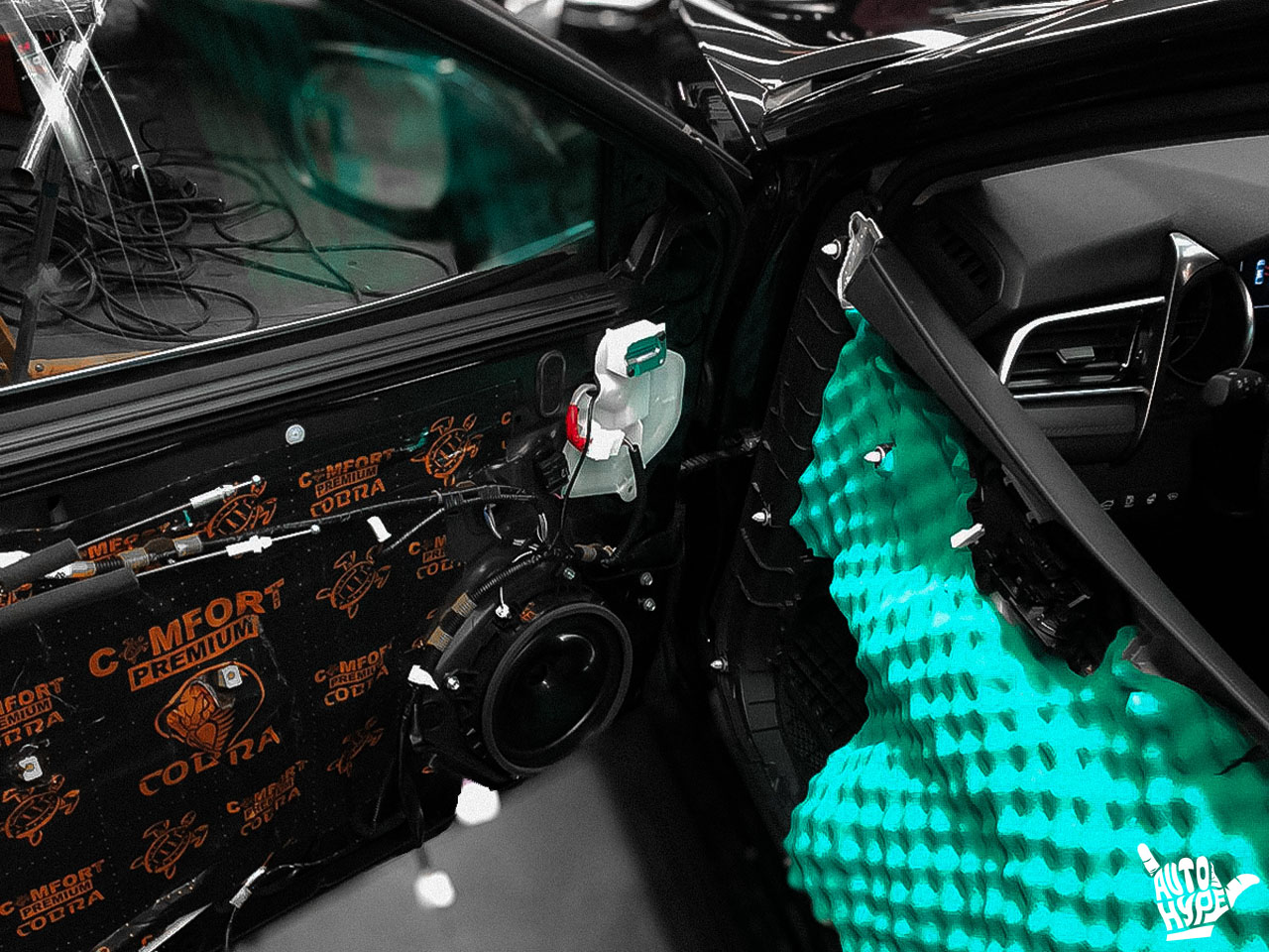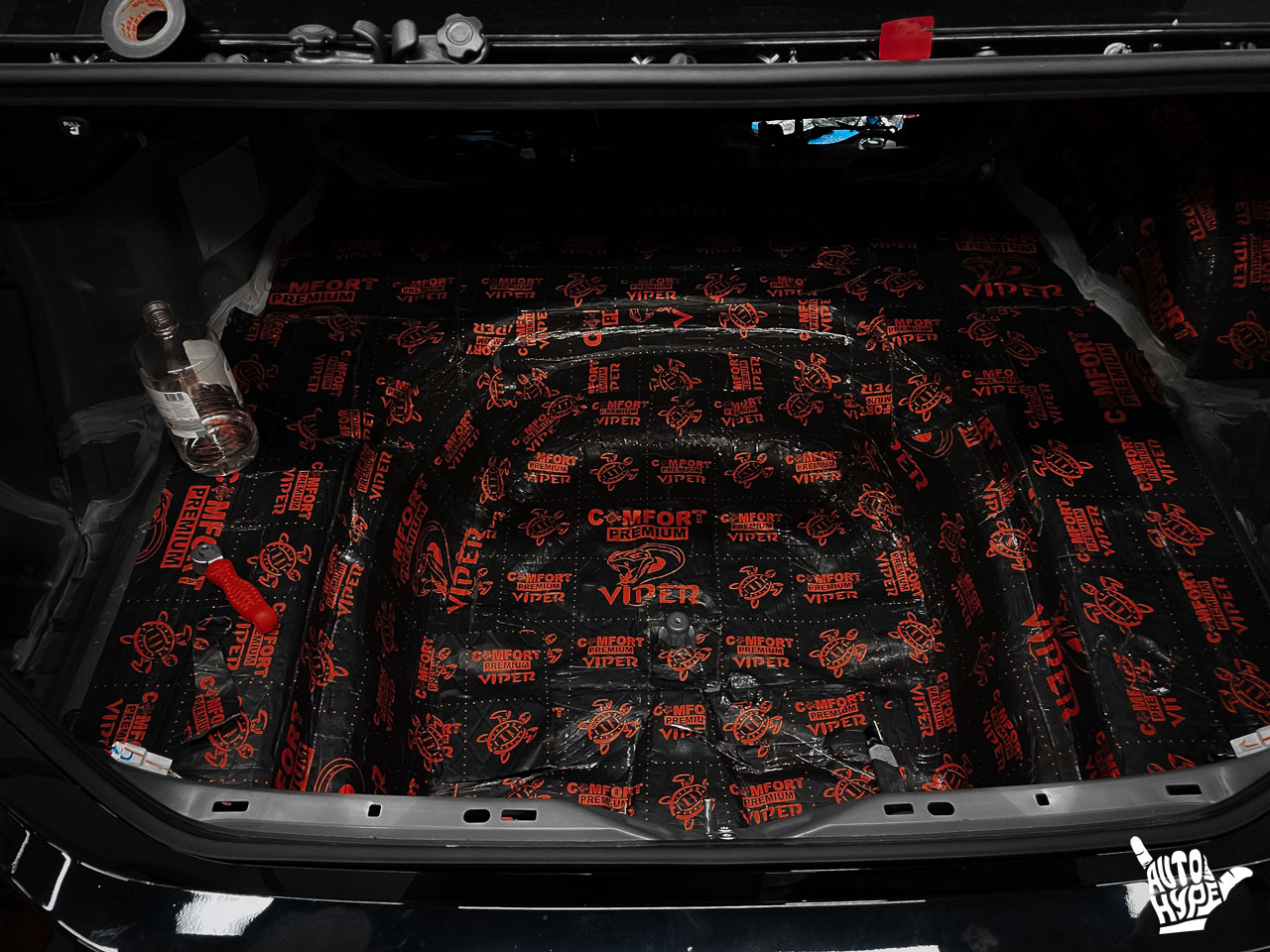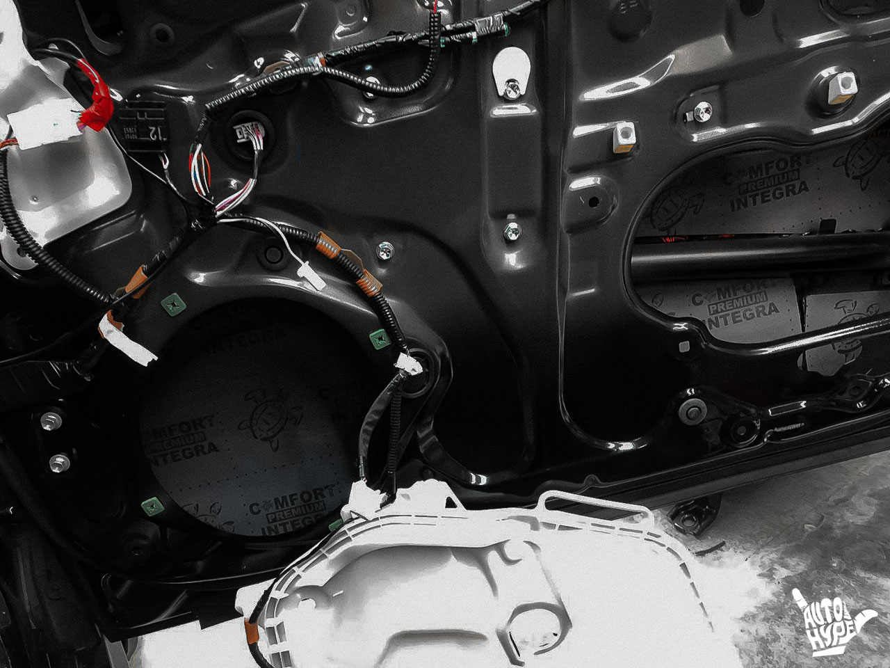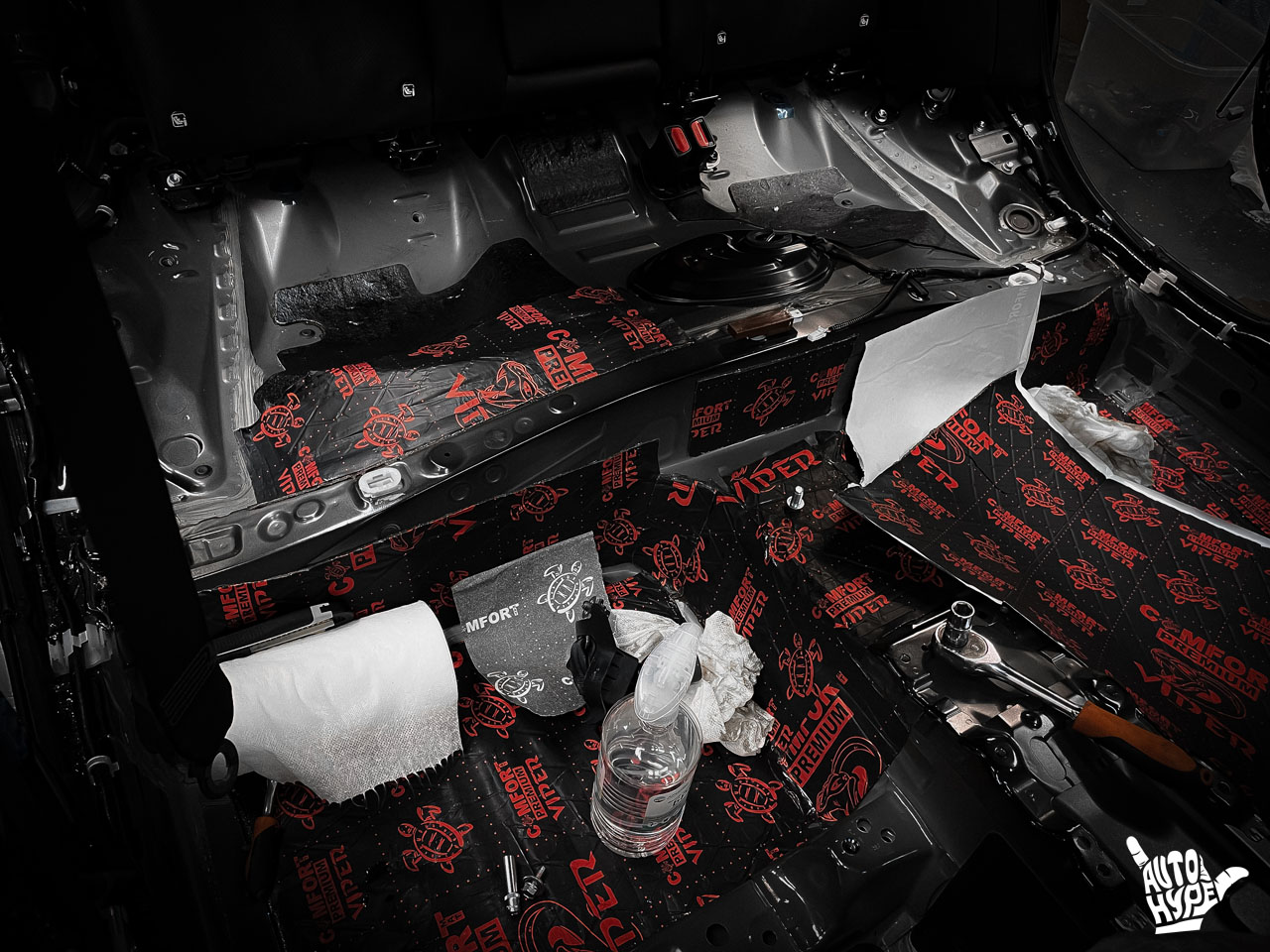 Чтобы полностью избавиться от посторонних шумов и скрипов, а также улучшить качество автозвука, выполнена комплексная шумоизоляция — обработаны двери, пол, багажное отделение, крыша и арки снаружи.