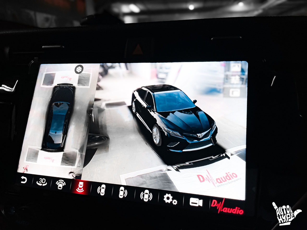 Также мы оснастили Camry полезным оборудованием. Установили на автомобиль автосигнализацию, заменили головное устройство на более продвинутое, а также смонтировали систему кругового обзора.
