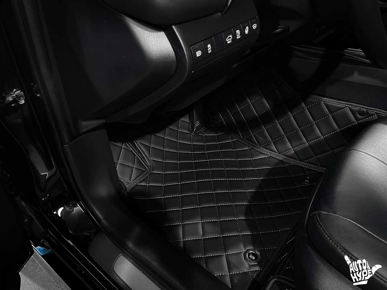Вся кожаная отделка салона тщательно почищена, а затем обработана профессиональным защитным кремом. Для пола изготовлены эффектные 3D коврики из экокожи с прострочкой ромбами.