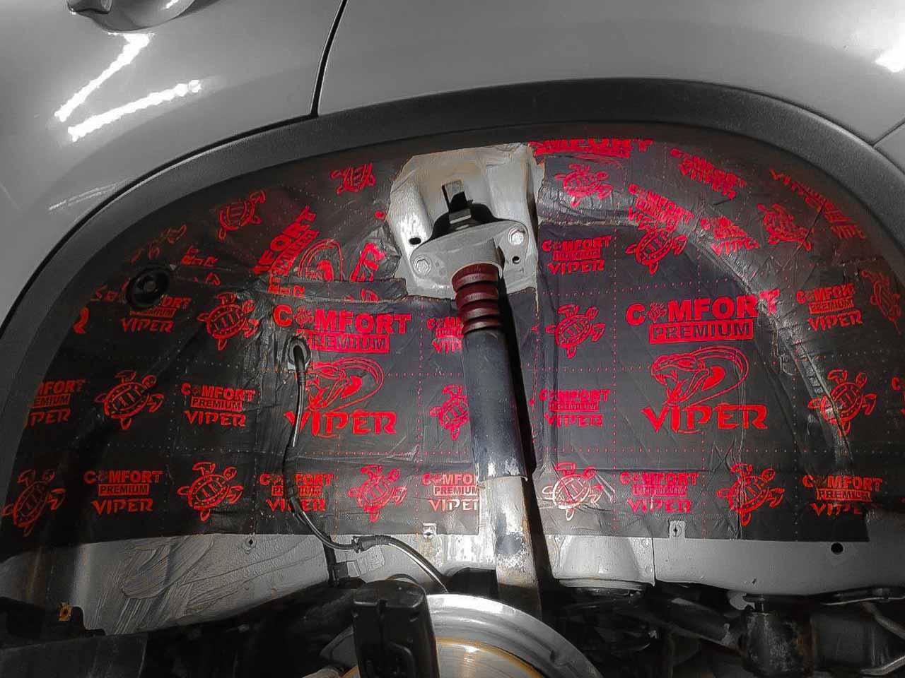 Шумоизоляция колесных ниш может проводиться как с внутренней стороны, так и снаружи. Наилучший результат дает комплексная, двусторонняя обработка всех 4-х арок автомобиля. При работе должны совместно использоваться вибродемпфирующие и звукоизолирующие материалы.